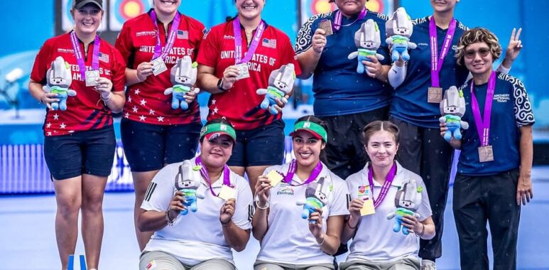 Maya Becerra, Mariana Bernal y Adriana Castillo conquistaron en Gwangju, Corea del Sur, el oro en la prueba por equipos de arco compuesto femenino.