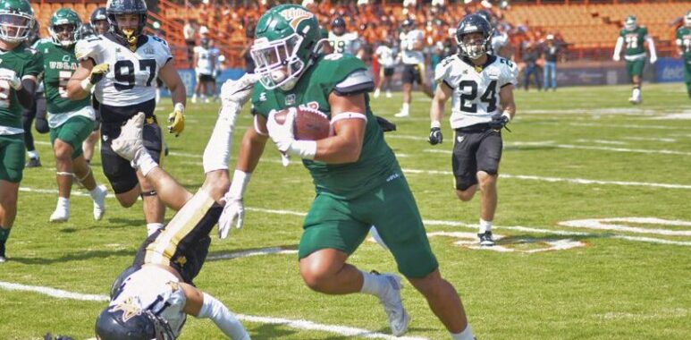 El reloj apenas iniciaba su marcha cuando el número uno, Denilson Santiago, encendió el estadio. Tomó el ovoide en el kickoff y lo regresó 83 yardas hasta las diagonales. Una jugada que marcó el tono del encuentro: agresivo, explosivo y con el sello verde y oro.