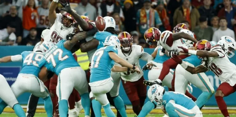 Los Dolphins (4-7) fueron detenidos dos veces en cuarta y gol, incluyendo dentro de los últimos dos minutos después de recuperar el balón en un regreso de despeje fallido por parte de los Commanders